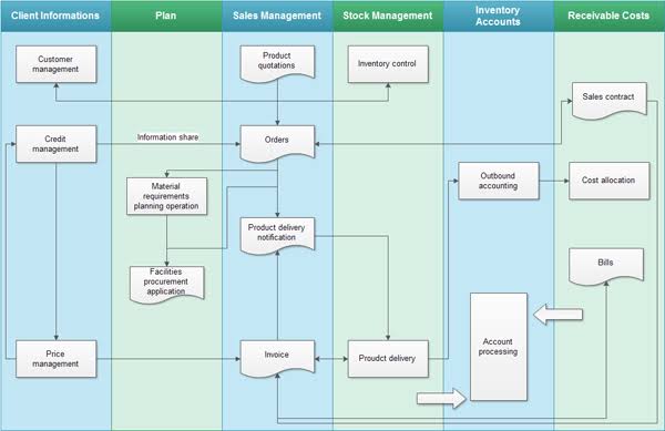 En este tipo de Diagrama de flujo de trabajo, cada una de las unidades dentro de una organización se separa, y sus interacciones se destacan. Puede proporcionar una visualización sofisticada de las posibles ineficiencias dentro de los grupos, así como del proceso general.